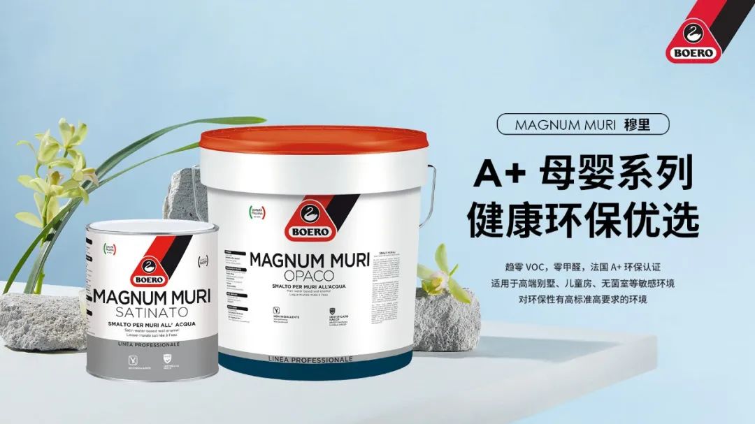 MAGNUM MURI 柏艾洛穆里是一款高品質(zhì)的水性瓷漆產(chǎn)品。漆膜堅(jiān)硬平整,如搪瓷般光滑,優(yōu)異的保光性與保色性,不粉化,不泛黃,具有極好的裝飾性,得利于其易清洗的特性,非常適合使用在人流量密集的區(qū)域,比如學(xué)校,醫(yī)院,廚房等場所。通過法國A+環(huán)保標(biāo)簽認(rèn)證,并獲得 HACCP適用于食品存在環(huán)境認(rèn)證,可用于任何敏感區(qū)域,適用于高端別墅,兒童房,無菌室等敏感環(huán)境,對環(huán)保性有高標(biāo)準(zhǔn)高要求的環(huán)境。